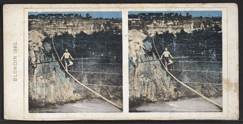 Clad in pink tights, soft-soled leather shoes, and plenty of spangles, the 19th century’s most famous funambulist, or tightrope walker to those of you less imaginative 21st-century types who don’t do crossword puzzles, Charles Blondin made the world’s first high wire trek across one of the world’s most famous waterfalls.